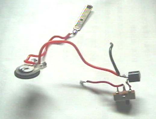 「電源供給ユニット」をバラバラにして、必要なパーツだけを、ニッパーで切って取り出した状態がこちら。可変抵抗と、スイッチ、そして、三端子レジュレータです。(3/18訂正)すみません、「2SC1722」と勘違いしてました。正しくは、出力電圧は3.3Vの三端子レジュレータ「AIC1722」互換品です(gigo様、情報提供ありがとうございました)。