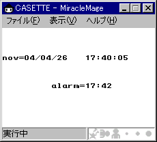 プログラムの実行画面です。rtc_get_datetime_struct関数を使って、RTCから現在の日付と時間を取得します。(画面はMiracleMageでキャプチャしました。ちなみにMiracleMageではカセット割り込みをサポートしていないみたいです。)